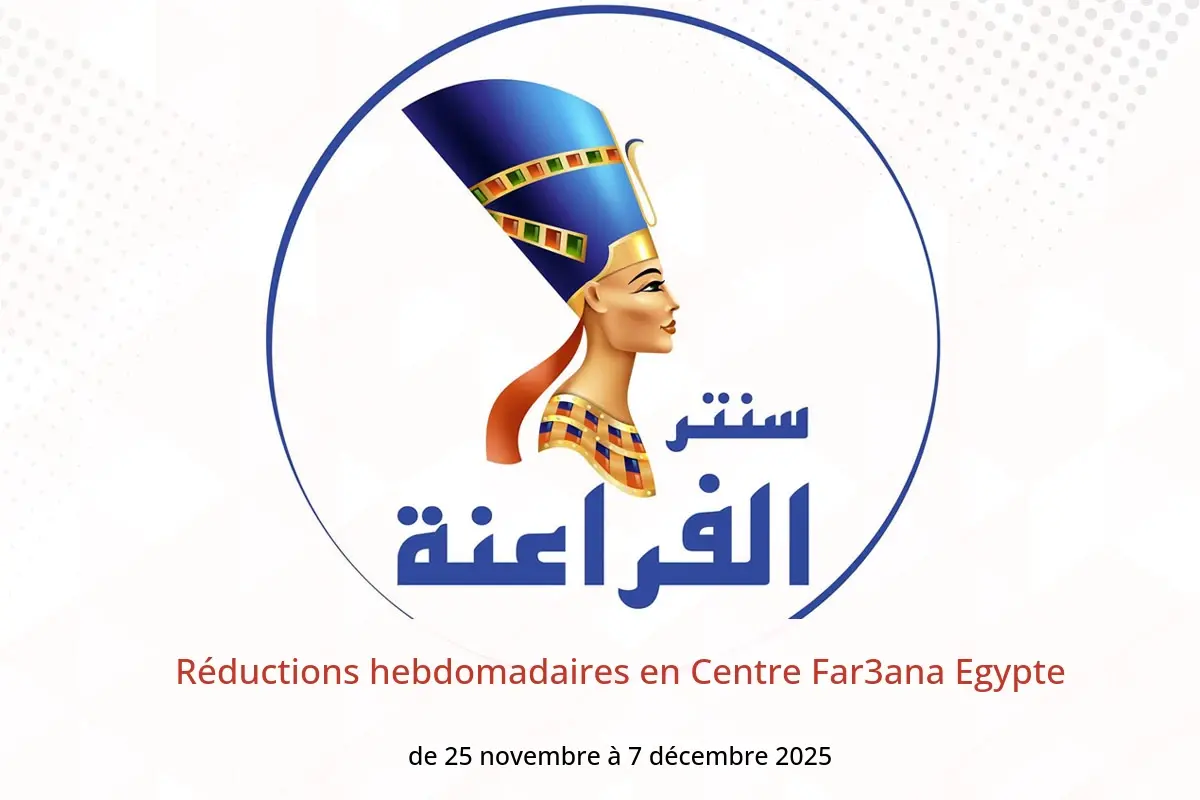 Centre Far3ana Egypte annonce de nouvelles réductions intitulées « Réductions hebdomadaires » disponibles jusqu'au 7 décembre 2025, de nouvelles offres et prix uniquement en Egypte.
